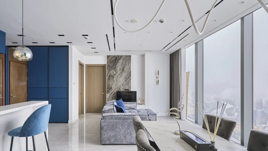 Апартамент полностью готов к проживанию: выполнен качественный дизайнерский ремонт, установлена современная мебель и встроенная техника. Из панорамных окон открывается впечатляющий вид на Москву.